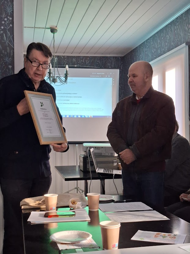 Kokouksen aluksi palkittiin yhdistyksen pitkäaikainen sihteeri Aulis Suominen hienolla kunniajäsendiplomilla.